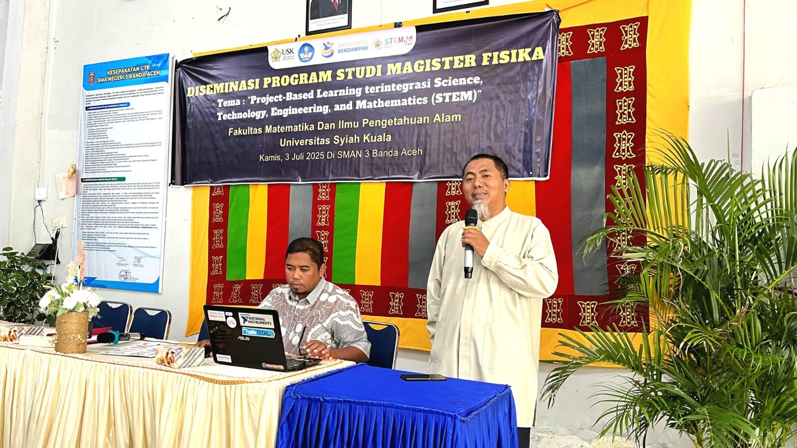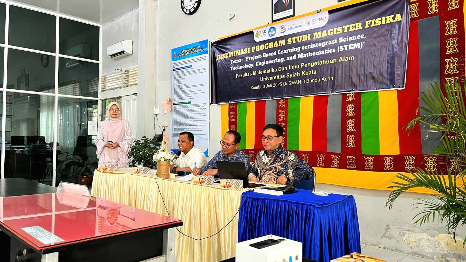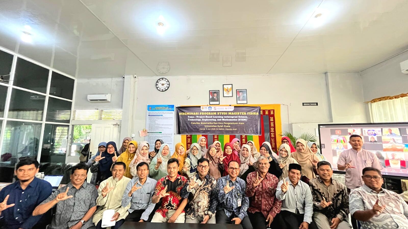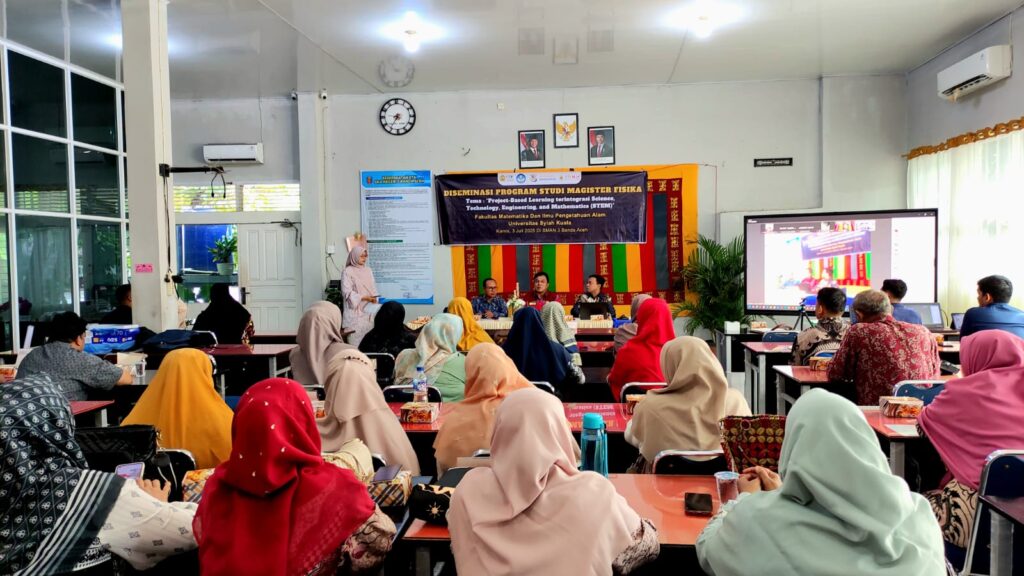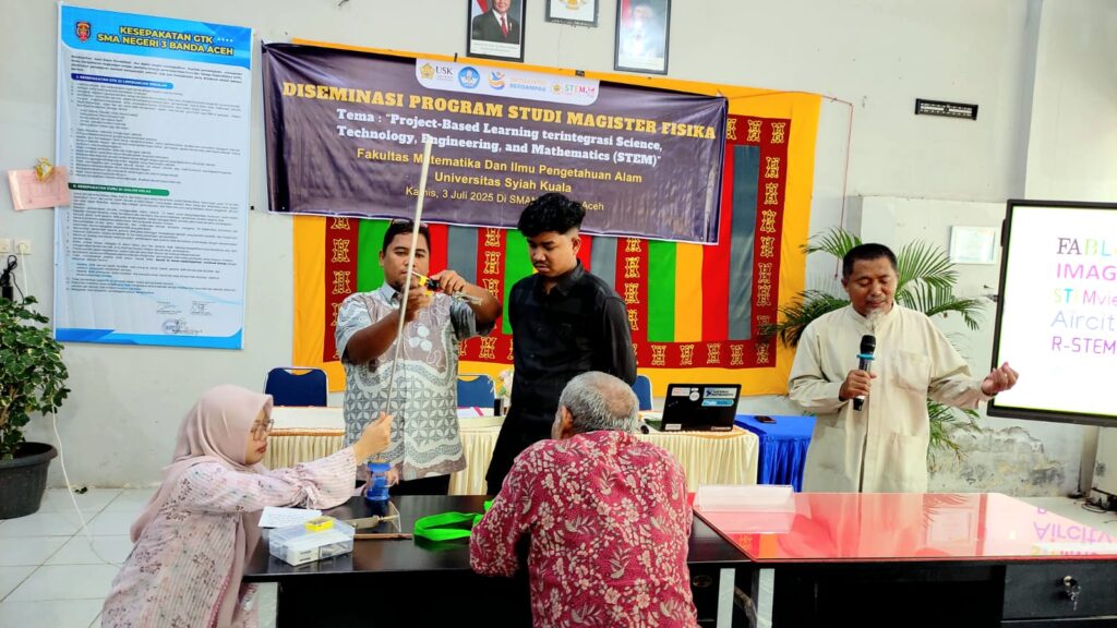 Banda Aceh, July 5, 2025 – The Master’s Program in Physics at the Faculty of Mathematics and Natural Sciences, Syiah Kuala University (USK), in collaboration with the Aceh Education Department, organized a program dissemination event themed “Integrated Project-Based Learning in Science, Technology, Engineering, and Mathematics (STEM).” The event was held in a hybrid format at SMAN 3 Banda Aceh and online via Zoom, with a total of 155 participants, including 30 in-person attendees and 125 online participants from various regions across Aceh Province.